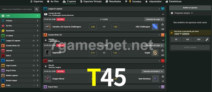 O T45 oferece uma grande seleção de opções de apostas em e-sports com probabilidades competitivas